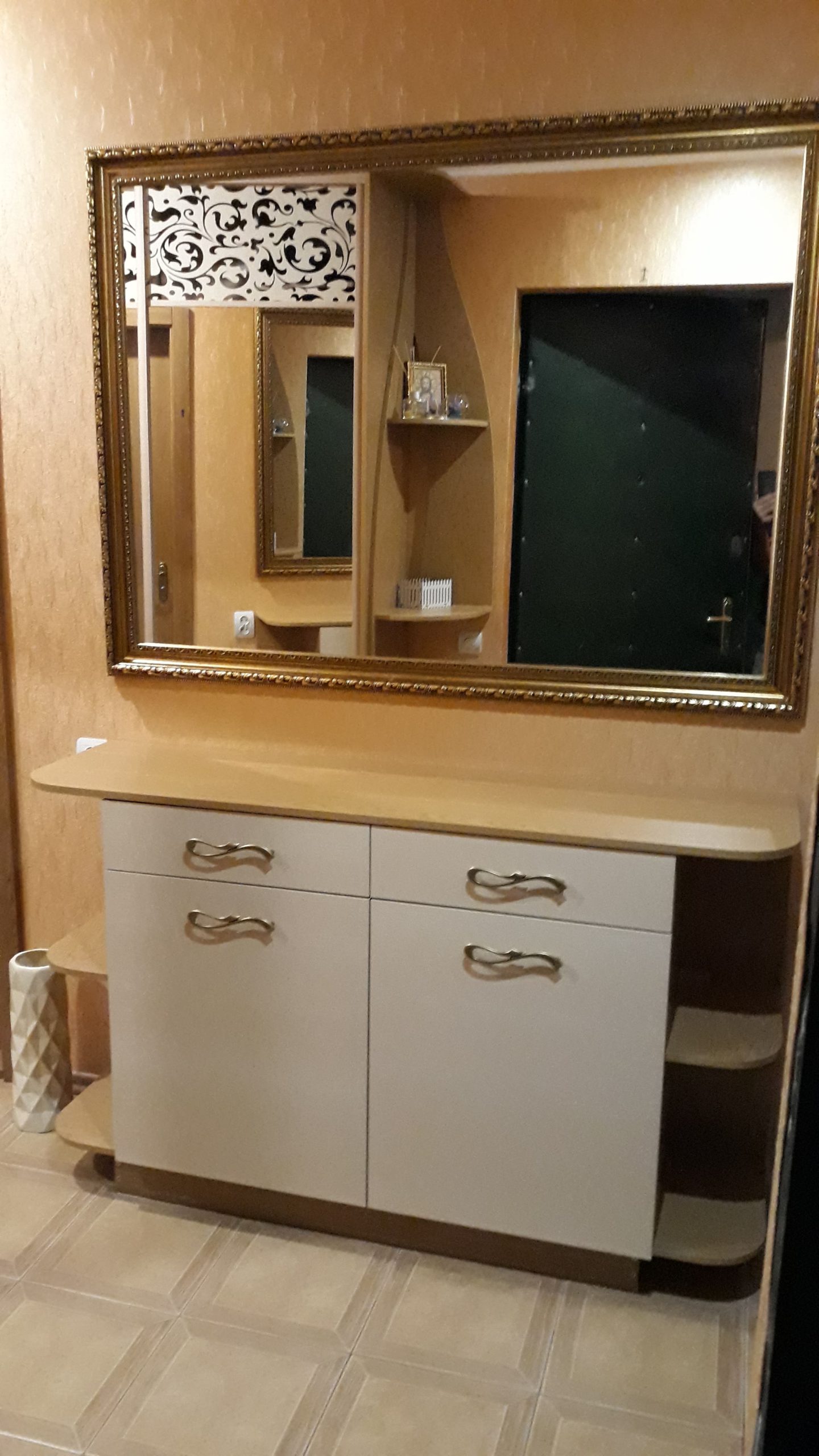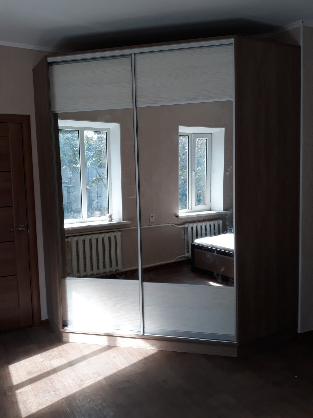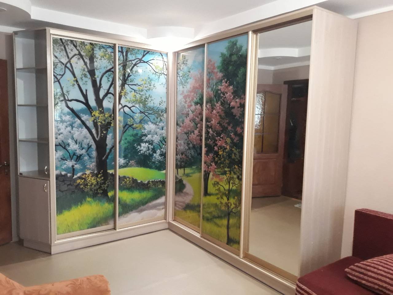 корпус ЛДСП дуб шамони светлый, система купе золото светлое, наполнение зеркало и фотопечать